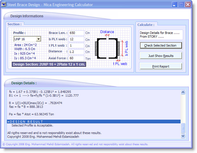 • Steel Brace Design  ابزاری برای طراحی بادبندهای فلزی متشکل از پروفیل های ناودانی معمول  بهمراه پلیت های تقویت جان